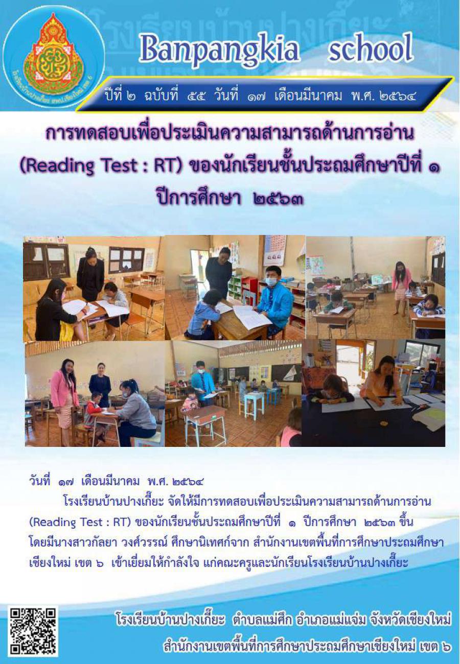 วันที่ 17 มีนาคม 2564 โรงเรียนบ้านปางเกี๊ยะ จัดให้มีการทดสอบเพื่อประเมินความสามารถด้านการอ่าน (Reading Test : RT) สำหรับนักเรียนชั้นประถมศึกษาปีที่ 1 ขึ้น โดยมีท่าน ศน.กัลยา วงศ์วรรณ์ เข้ามาเยี่ยมให้กำลังใจ แก่คณะครูและนักเรียนที่เข้ารับการทดสอบประเมินความสามารถด้านการอ่านในครั้งนี้ S:0