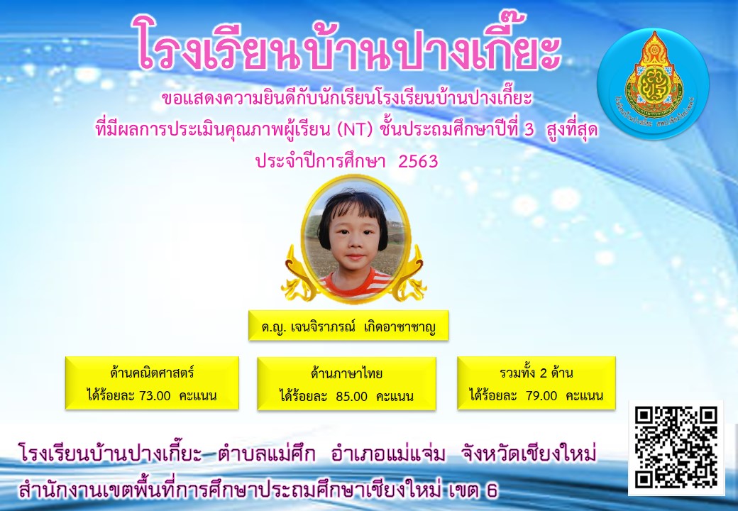 โรงเรียนบ้านปางเกี๊ยะขอชื่นชมและแสดงความยินดีกับนักเรียนโรงเรียนบ้านปางเกี๊ยะ ที่ได้รับคะแนนสูงสุด จากผลการประเมินคุณภาพผู้เรียน (NT) ชั้นประถมศึกษาปีที่ 3  ปีการศึกษา 2563