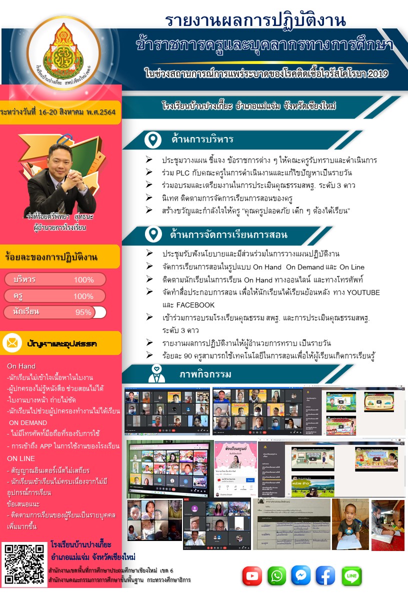 รายงานผลการปฏิบัติงานของข้าราชการครูและบุคลากรทางการศึกษาโรงเรียนบ้านปางเกี๊ยะ ในช่วงสถานการณ์การแพร่ระบาดของโรคติดเชื้อไวรัสโคโรนา 2019 ระหว่างวันที่ 16-20 สิงหาคม 2564