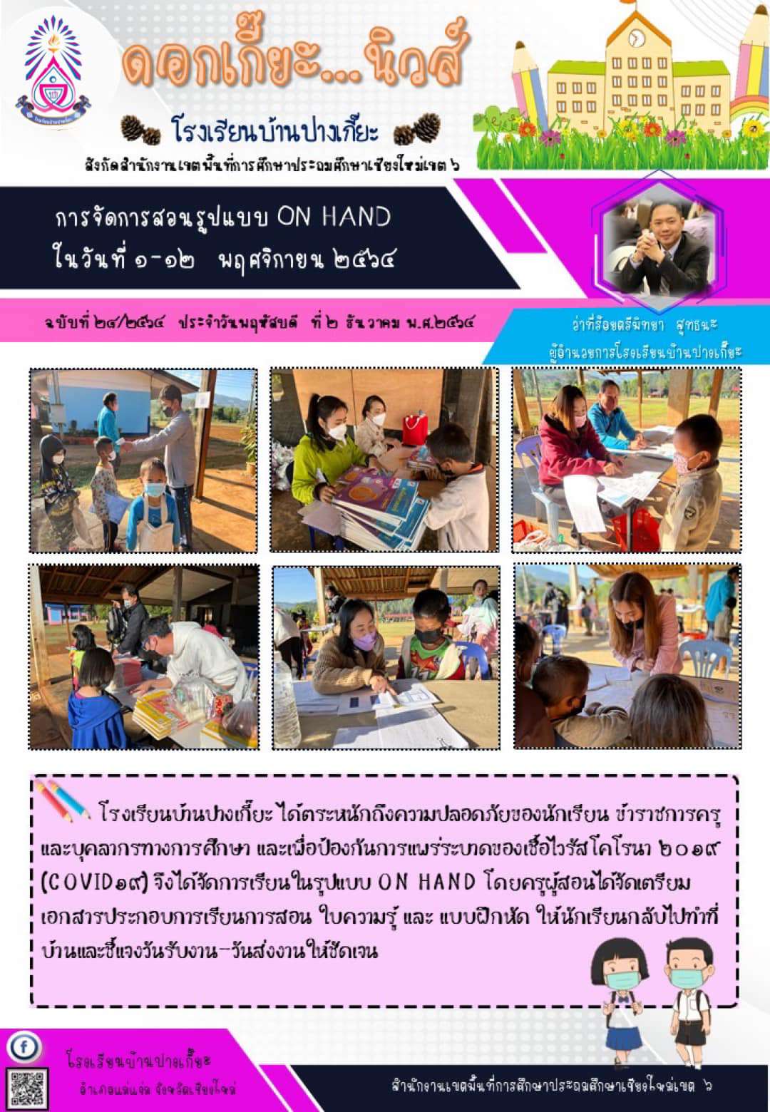 โรงเรียนบ้านปางเกี๊ยะได้จัดการเรียนในรูปแบบ ON HAND ครูผู้สอนได้จัดเตรียมเอกสารประกอบการสอน ใบความรู้ แบบฝึกหัด และจัดเตรียมอาหาร โดยชี้แจงวันรับงาน-วันส่งงาน ให้ชัดเจน