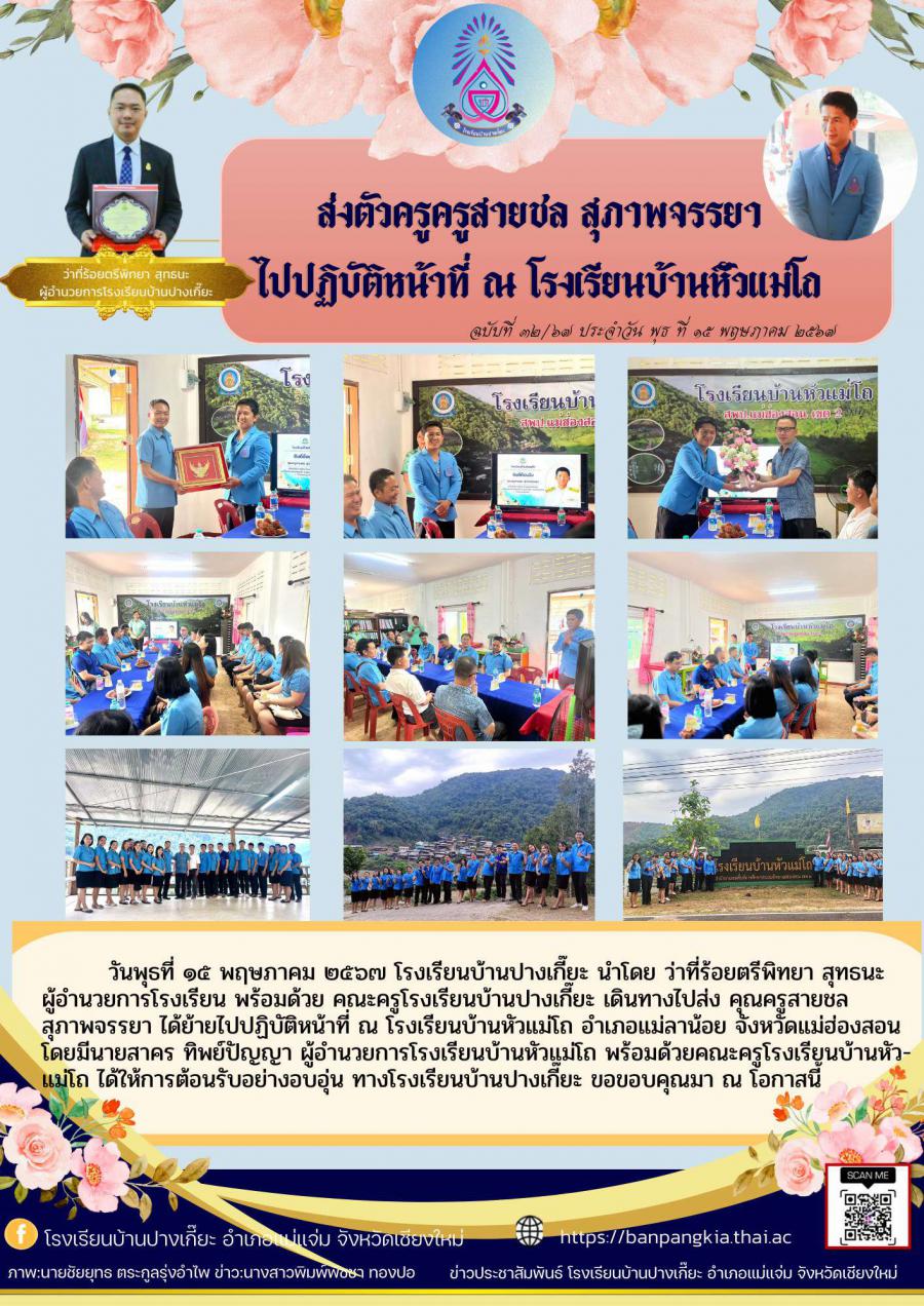 ส่งตัว คุณครูสายชล สุภาพจรรยา เนื่องในโอกาส ย้ายไปปฏิบัติหน้าที่ ณ โรงเรียนบ้านหัวแม่โถ