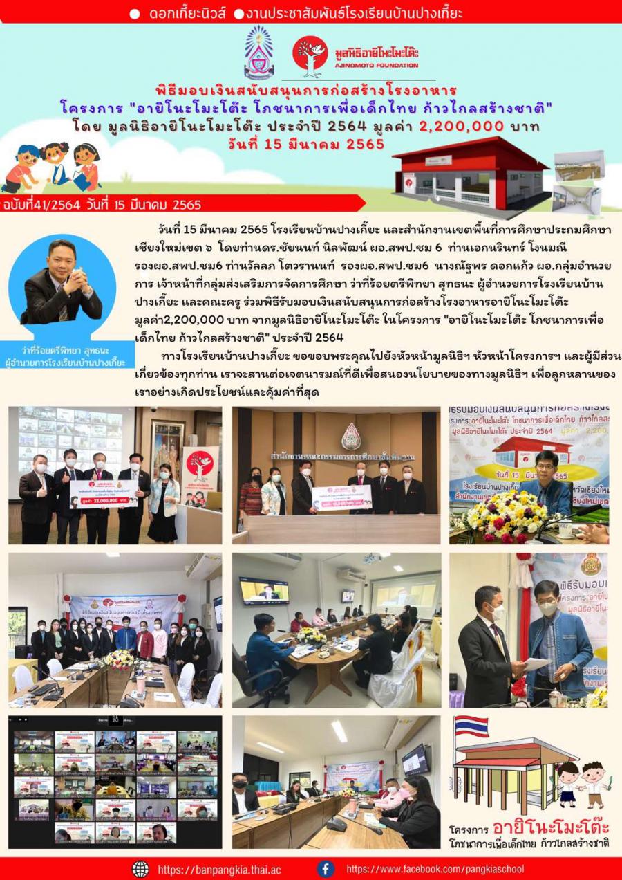 วันที่ 15 มีนาคม 2565 โรงเรียนบ้านปางเกี๊ยะ และสำนักงานเขตพื้นที่การศึกษาประถมศึกษาเชียงใหม่เขต ๖ โดยท่านดร.ชัยนนท์ นิลพัฒน์ ผอ.สพป.ชม 6 ท่านเอกนรินทร์ โงนมณี รองผอ.สพป.ชม6 ท่านวัลลภ โตวรานนท์ รองผอ.สพป.ชม6 นางณัฐพร ดอกแก้ว ผอ.กลุ่มอำนวยการ เจ้าหน้าที่กลุ่มส่งเสริมการจัดการศึกษา ว่าที่ร้อยตรีพิทยา สุทธนะ ผู้อำนวยการโรงเรียนบ้านปางเกี๊ยะ และคณะครู ร่วมพิธีรับมอบเงินสนับสนุนการก่อสร้างโรงอาหารอายิโนะโมะโต๊ะ มูลค่า2,200,000 บาท จากมูลนิธิอายิโนะโมะโต๊ะ ในโครงการ "อายิโนะโมะโต๊ะ โภชนาการเพื่อเด็กไทย ก้าวไกลสร้างชาติ" ประจำปี 2564 ทางโรงเรียนบ้านปางเกี๊ยะ ขอขอบพระคุณไปยังหัวหน้ามูลนิธิฯ หัวหน้าโครงการฯ และผู้มีส่วนเกี่ยวข้องทุกท่าน เราจะสานต่อเจตนารมณ์ที่ดีเพื่อสนองนโยบายของทางมูลนิธิฯ เพื่อลูกหลานของเราอย่างเกิดประโยชน์และคุ้มค่าที่สุด