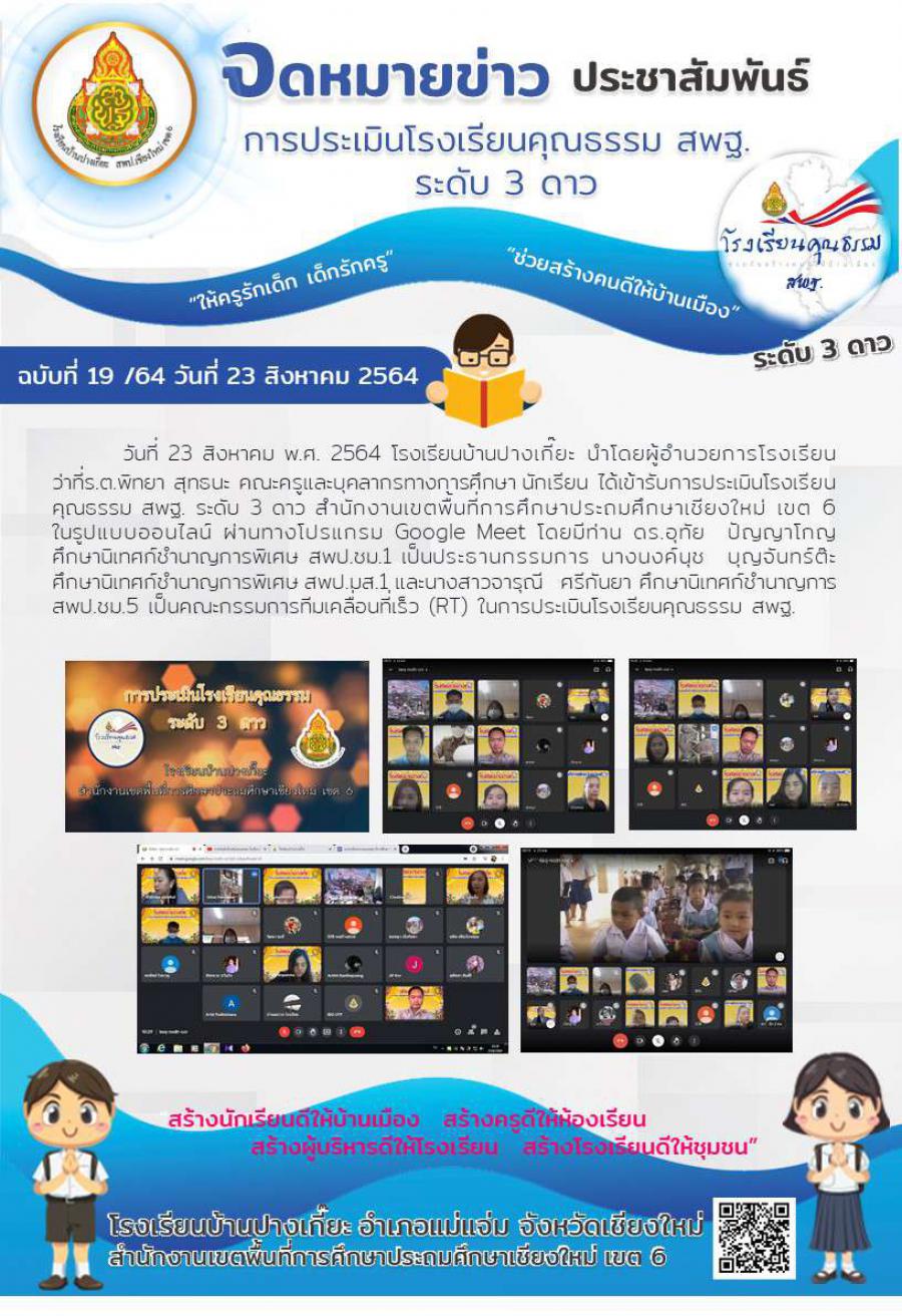 วันที่ 23  สิงหาคม 2564 โรงเรียนบ้านปางเกี๊ยะ นำโดย ผู้อำนวยการโรงเรียน ว่าที่ รต.พิทยา สุทธนะ คณะครูและบุคลากรทางการศึกษา นักเรียนได้เข้ารับการประเมินโรงเรียนคุณธรรม สพฐ. ระดับ 3 ดาวจากสำนักงานเขตพื้นที่การศึกษาประถมศึกษาเชียงใหม่ เขต 6 และคณะกรรมการทีมเคลื่อนที่เร็ว (RT) ของจังหวัดเชียงใหม่