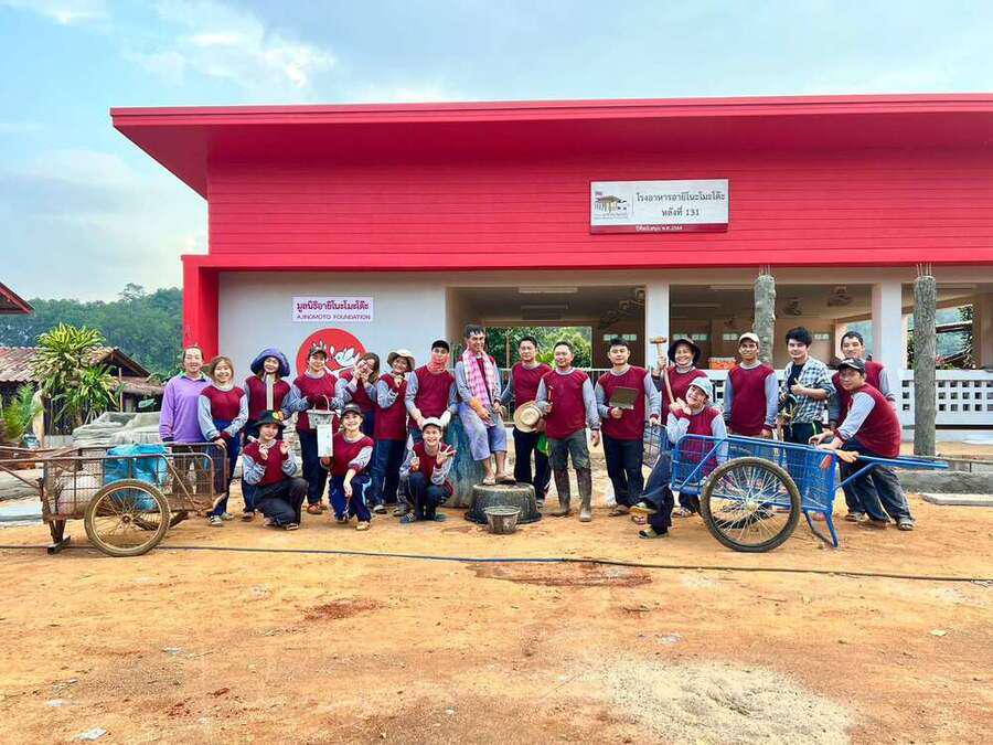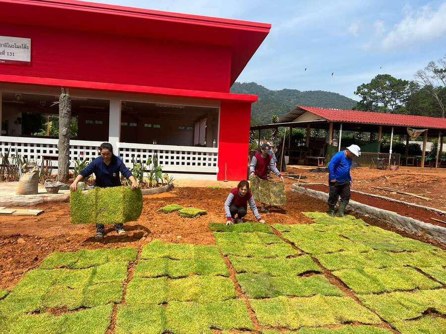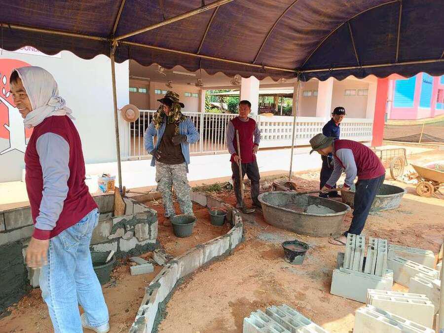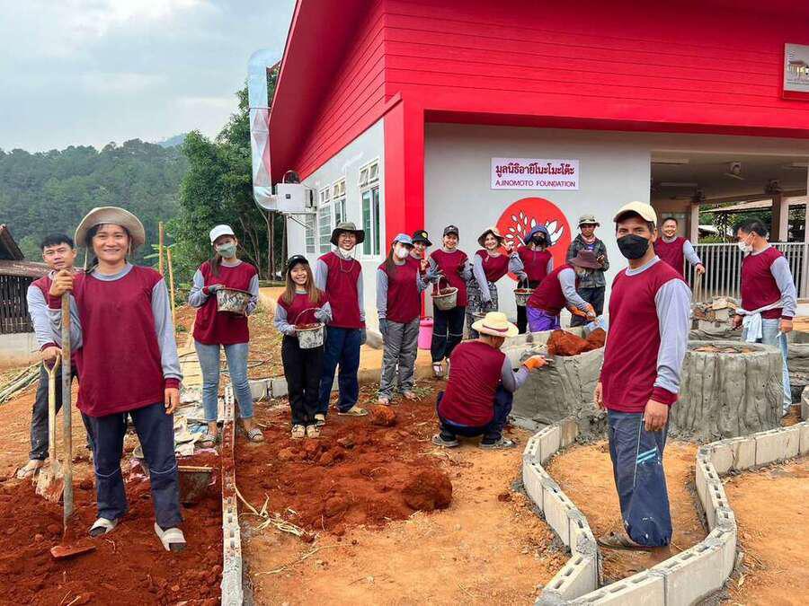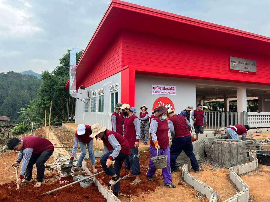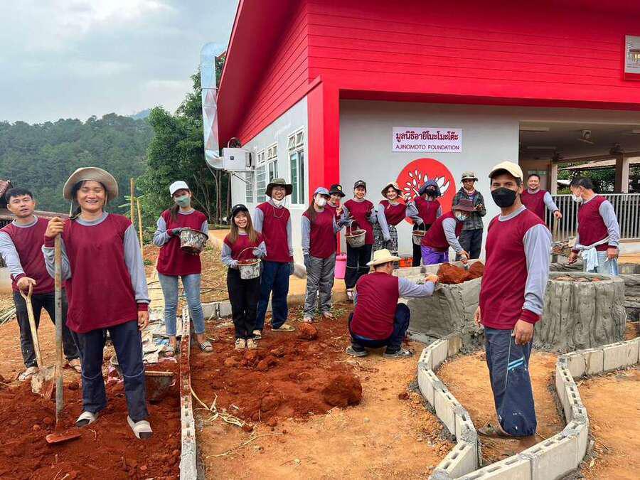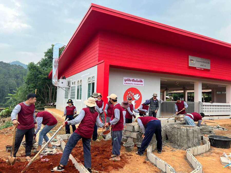 การปรับปรุงภูมิทัศน์ บริเวณรอบโรงอาหารให้สวยงาม เพื่อเตรียมพร้อมในการเปิดอาคารโรงอาหารอายิโนะโมะโต๊ะ