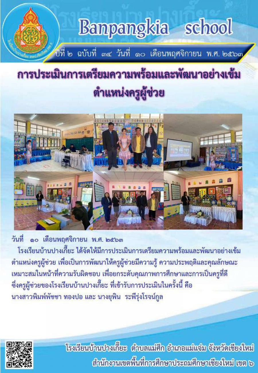 โรงเรียนบ้านปางเกี๊ยะจัดให้มีการประเมินการเตรียมความพร้อมและพัฒนาอย่างเข้ม ตำแหน่งครูผู้ช่วย เมื่อวันที่ 10 พฤศจิกายน 2563 โดยมีผู้เข้ารับการประเมินครั้งนี้ จำนวน 2 คน คือ นางสาวพิมพ์พัชชา ทองปอ และนางยุพิน ระพีรุ่งโรจน์กูล S:0