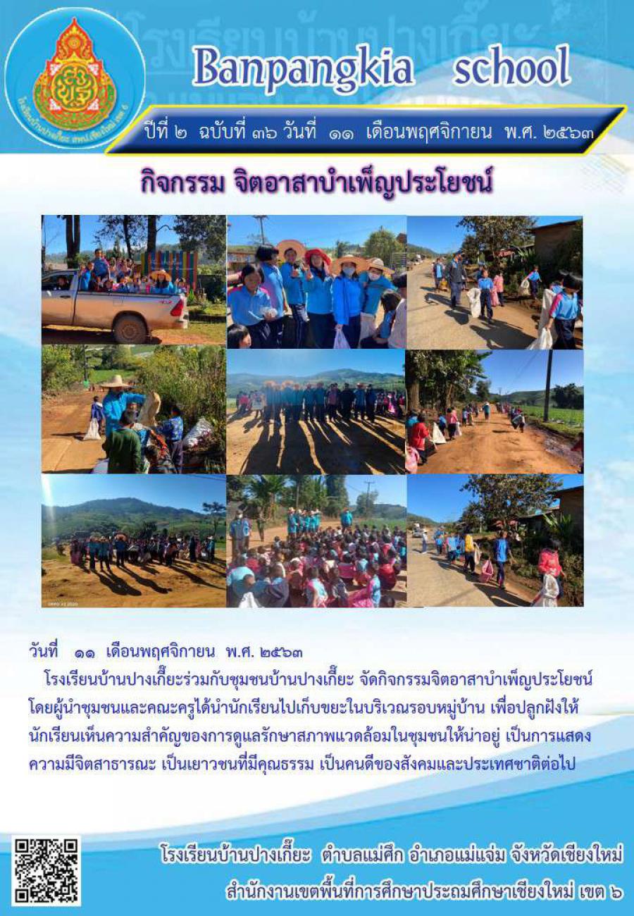 โรงเรียนบ้านปางเกี๊ยะ ร่วมกับชุมชนบ้านปางเกี๊ยะ จัดกิจกรรมจิตอาสาบำเพ็ญประโยชน์ โดยการนำนักเรียนไปเก็บขยะในบริเวณชุมชน เพื่อปลูกฝังให้นักเรียนเห็นความสำคัญของการดูแลรักษาสภาพแวดล้อมในชุมชนให้น่าอยู่ S:0
