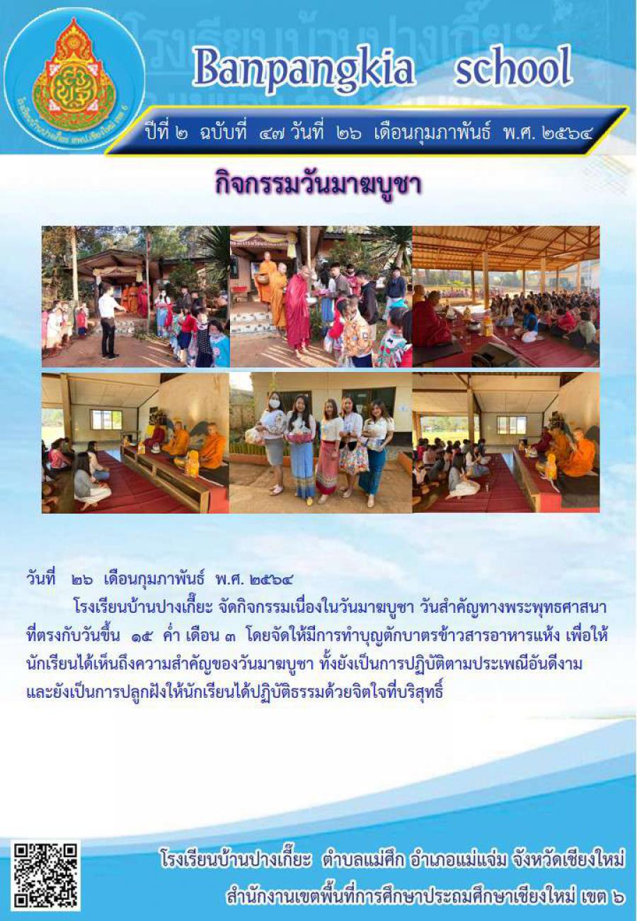 วันที่ 26 กุมภาพันธ์ 2564 โรงเรียนบ้านปางเกี๊ยะจัดกิจกรรมเนื่องในวันมาฆบูชาเพื่อให้นักเรียนได้เห็นถึงความสำคัญของวันมาฆบูชา โดยจัดให้มีการทำบุญตักบาตร ฟังธรรมเทศนา และกิจกรรมการเรียนรู้ต่าง ๆ S:0