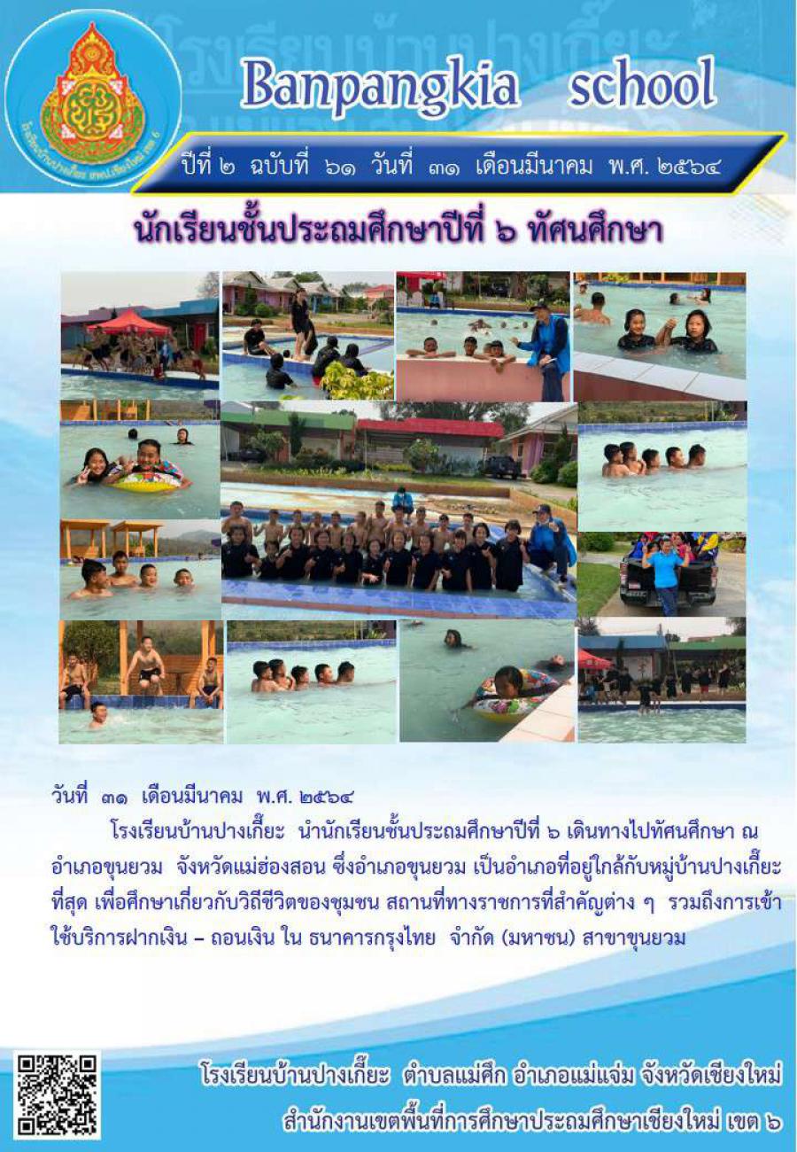 วันที่ 31 มีนาคม 2564 โรงเรียนบ้านปางเกี๊ยะ นำนักเรียนชั้นประถมศึกษาปีที่ 6 ไปทัศนศึกษา ณ อำเภอขุนยวม เพื่อศึกษาเกี่ยวกับวิถีชีวิตของชุมชน สถานที่สำคัญต่าง ๆ ในอำเภอขุนยวม รวมถึง การเข้าไปใช้บริการฝากเงิน - ถอนเงิน ในธนาคารกรุงไทย S:0