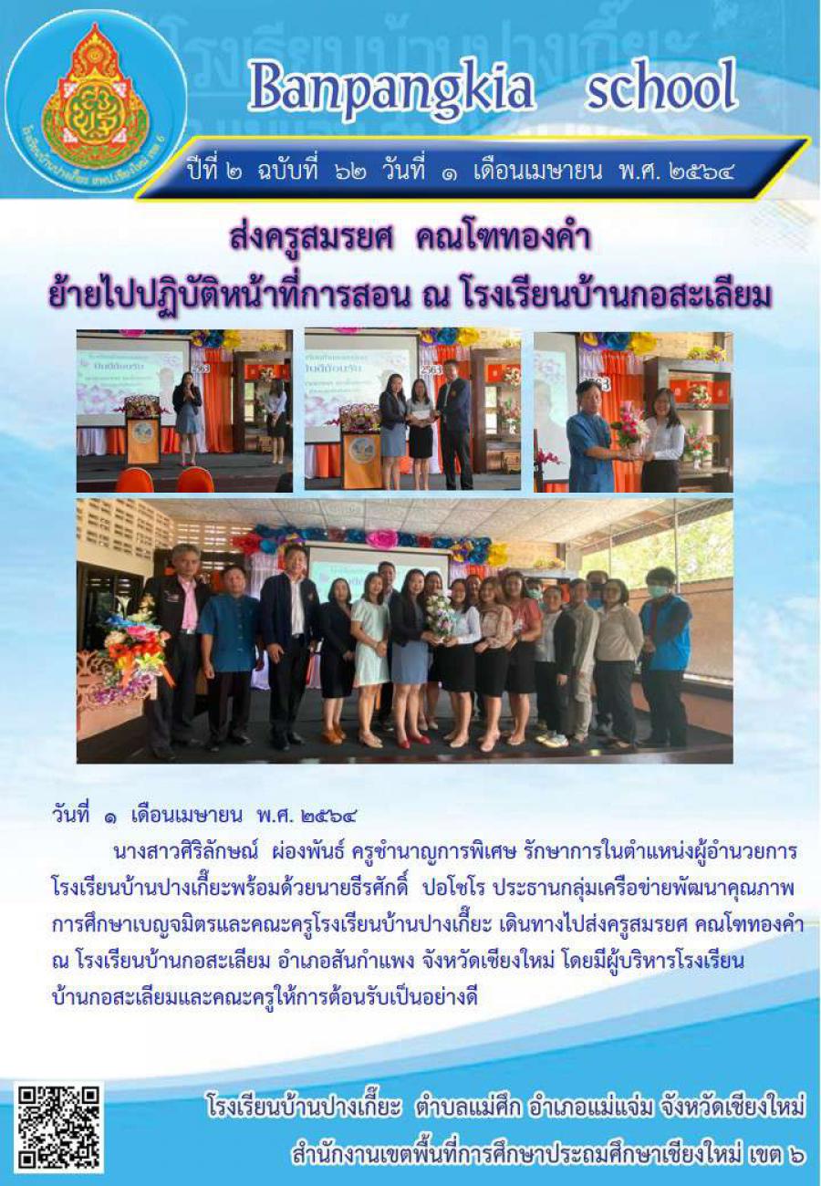 วันที่ 1 เมษายน 2564 นางสาวศิริลักษณ์ ผ่องพันธ์ รักษาการในตำแหน่งผู้อำนวยการโรงเรียนบ้านปางเกี๊ยะพร้อมด้วยนายธีรศักดิ์ ปอโชโร และคณะครูโรงเรียนบ้านปางเกี๊ยะได้เดินทางไปส่งครูสมรยศ คณโฑทองคำ ย้ายไปปฏิบัติหน้าที่การสอน ณ โรงเรียนบ้านกอสะเลียม อำเภอสันกำแพง จังหวัดเชียงใหม่ โดยมีผู้อำนวยการโรงเรียนบ้านกอสะเลียมและคณะครูให้การต้อนรับเป็นอย่างดี S:0