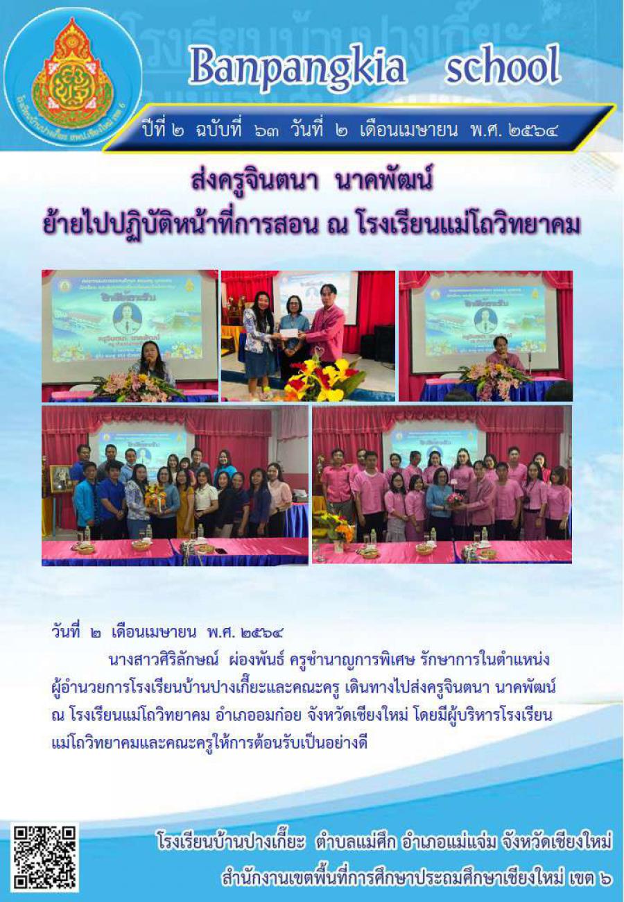 วันที่ 2 เมษายน 2564 นางสาวศิริลักษณ์ ผ่องพันธ์ รักษาการในตำแหน่งผู้อำนวยการโรงเรียนบ้านปางเกี๊ยะ และคณะครูได้เดินทางไปส่งครูจินตนา นาคพัฒน์ ย้ายไปปฏิบัติหน้าที่การสอน ณ โรงเรียนแม่โถวิทยาคม อำเภออมก๋อย จังหวัดเชียงใหม่ โดยมีผู้อำนวยการโรงเรียนแม่โถวิทยาคมและคณะครูให้การต้อนรับเป็นอย่างดี S:0