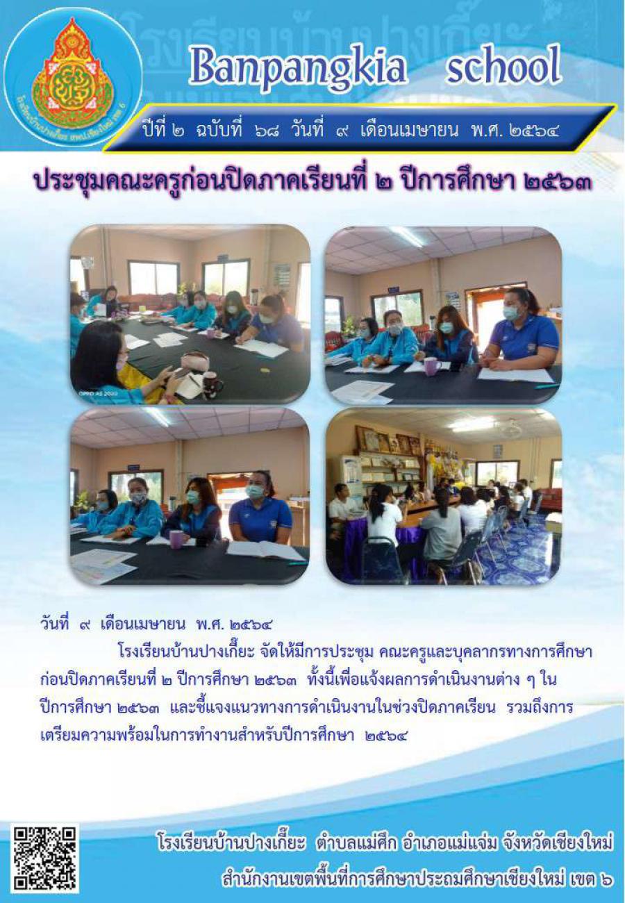 วันที่ 9 เมษายน 2564 โรงเรียนบ้านปางเกี๊ยะจัดให้มีการประชุม คณะครูและบุคลากรทางการศึกษา ก่อนปิดภาคเรียนที่ 2 ปีการศึกษา2563 ทั้งนี้เพื่อแจ้งผลการดำเนินงานต่าง ๆ ในปีการศึกษา 2563 และชี้แจงแนวดำเนินงานในช่วงปิดภาคเรียน รวมถึงการเตรียมความพร้อมในการทำงานสำหรับปีการศึกษา 2564 S:0